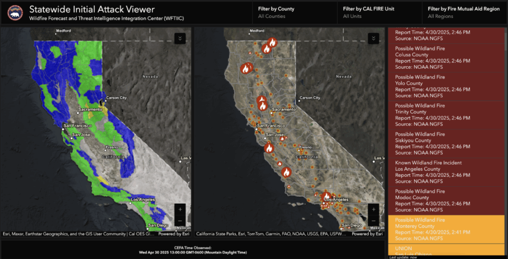 Multiple potential wildfire starts in California detected by NOAA’s Next Generation Fire System on April 30, 2025, are displayed on this California Office of Emergency Services dashboard.