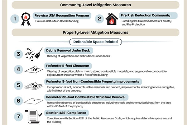 California’s recent regulations. This PDF document by Carolyn Kousky and Xuesong You, from Insurance for Good (insuranceforgood.org), provides a comprehensive breakdown of California’s recent wildfire insurance-related regulations, incentives, and discounts. It includes detailed mitigation discounts given by California’s top insurers. Click on the image below to view the PDF: