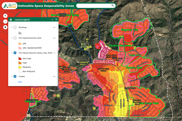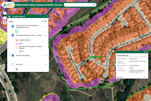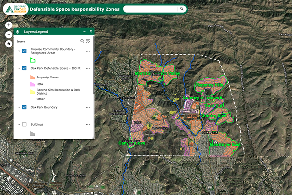 This collaboration resulted in the creation of the Defensible Space Responsibility Zones interactive web map which provides Oak Park residents with an effective and user-friendly way to engage with defensible space information. This publicly accessible tool displays the 100-foot defensible space zones and identifies the entity (individual homeowners, homeowners’ associations (HOAs), or the Rancho Simi Recreation and Park District) responsible for the defensible space. The map also allows users to view acreage of defensible space for a given property, perform measurements (both linear and areal), print custom maps, and more.